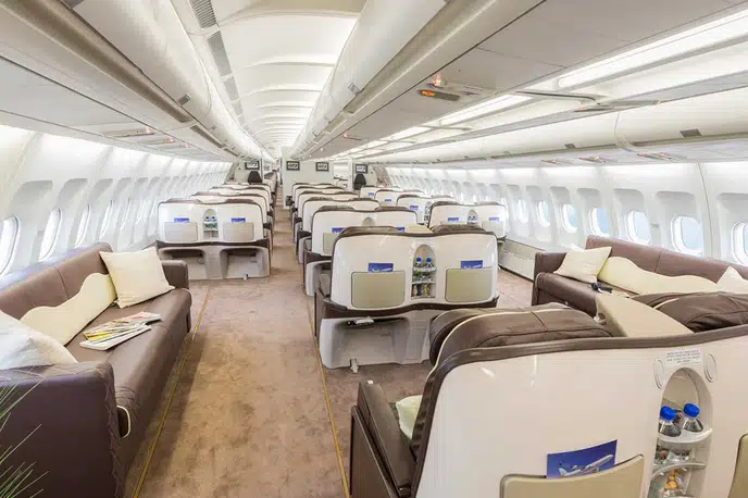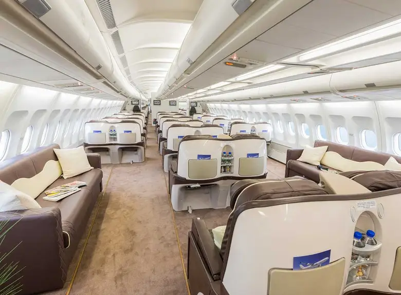 - Просторный и Комфортабельный Салон: Широкий фюзеляж обеспечивает просторный салон с двумя проходами, что создает комфортную атмосферу даже во время длительных перелетов. Пассажиры могут насладиться большим пространством для ног и удобными креслами.