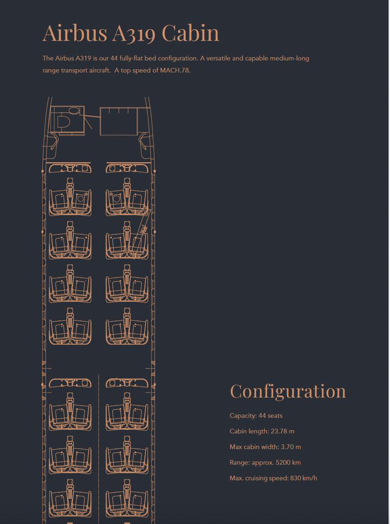 Airbus 319 Corporate Jet 8Q-FBA рассчитан на 44 пассажиров. Багажное отделение объёмом 34.0 м³ позволяет разместить до 101 чемоданов L-размера . Максимальная дальность полёта — 11100 км.