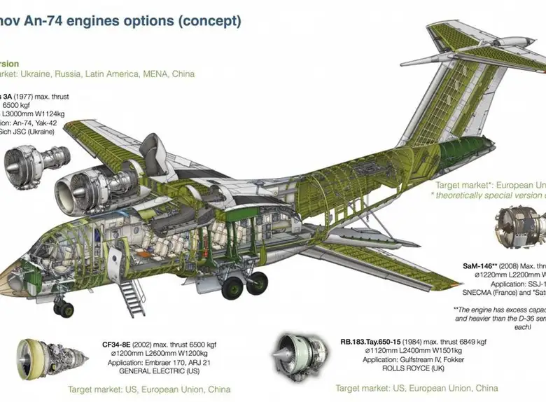 РАЗМЕРЫ ГРУЗОВОГО ОТДЕЛЕНИЯ 1050x215x220 СМ / 413"x84"x86" РАЗМЕР ДВЕРИ 240x227 CM / 94"x89" Летно-технические характеристики Экипаж, чел. 4 Размах крыла, м 31,89 Длина, м 28,07 Высота, м 8,65 Площадь крыла, м2 98,62 Масса пустого самолета, кг 19000 Максимальная взлетная масса, кг 35000 Бесфорсажная тяга, кгс 13000 Максимальная скорость, км/ч 700 Крейсерская скорость, км/ч 600 Практическая дальность, км 4300 Практическая дальность, км 2800 Практический потолок, м 11800 Грузоподъемность 52 пассажира или до 10 000 кг груза