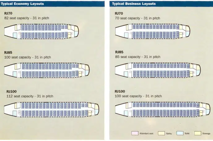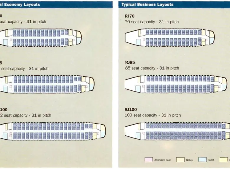 - Просторный салон с высотой потолка 2 метра создает ощущение пространства, выгодно отличая Avro RJ 100 от более тесных CRJ Series и некоторых моделей Embraer.