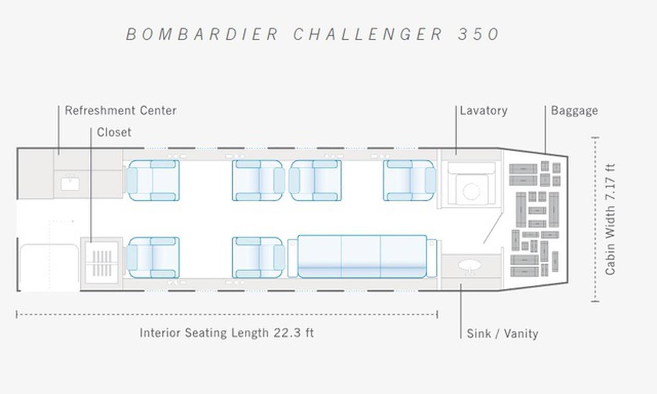 Challenger 350 OE-HRS рассчитан на 6 пассажиров. Багажное отделение объёмом 3.0 м³ позволяет разместить до 8 чемоданов L-размера . Максимальная дальность полёта — 5926 км.