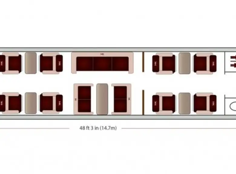 Challenger 850 выделяется среди конкурентов исключительно просторным салоном, разделенным на три отдельные зоны. С общей длиной 14,76 метров и шириной 2,49 метра, этот бизнес-джет предлагает до 15 пассажирских мест в различных конфигурациях. Высота салона составляет 1,85 метра, что обеспечивает комфортное передвижение в полный рост.