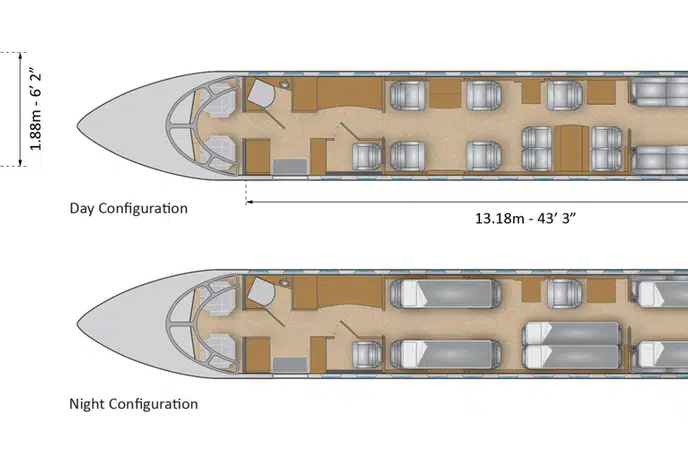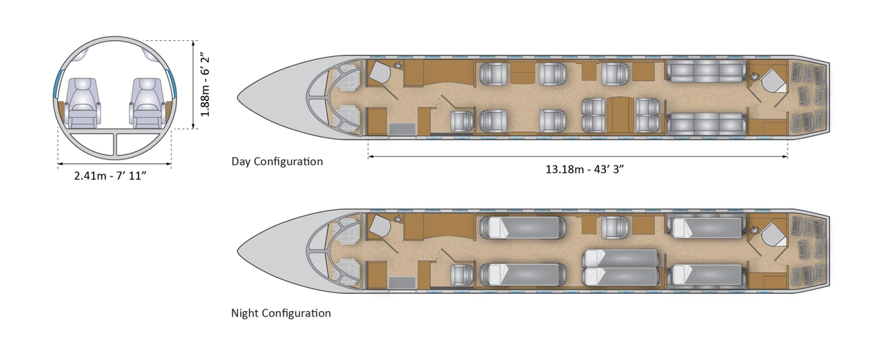 - Длина салона: 13,18 м (43,3 фута)