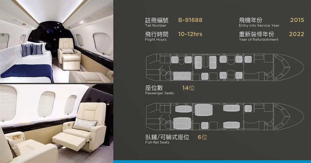 Global 6000 с регистрационным номером B-91688 относится к классу Ultra long range и эксплуатируется авиакомпанией Skyvision Aviation Corp.. Самолёт базируется в Taipei, Taiwan (TSA) и доступен для коммерческих чартеров. q