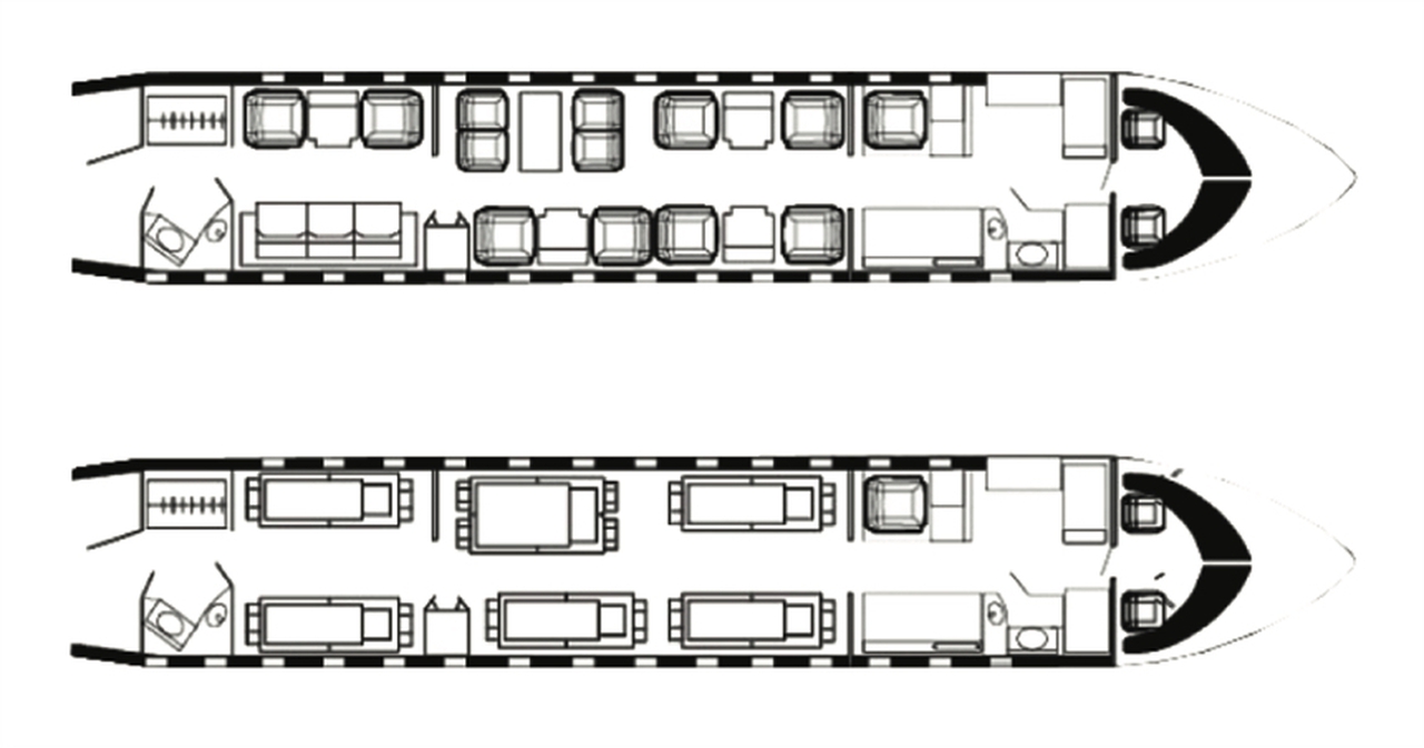 Global Express HB-JGF рассчитан на 12 пассажиров. Багажное отделение объёмом 5.66 м³ позволяет разместить до 16 чемоданов L-размера . Максимальная дальность полёта — 11390 км.