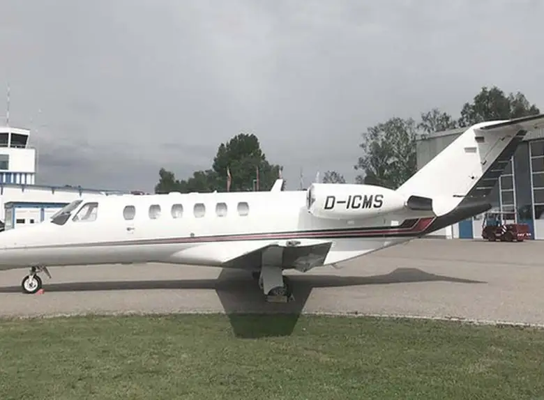 Citation CJ2+ D-ICMS . Багажное отделение объёмом 2.1 м³ позволяет разместить до 6 чемоданов L-размера . Максимальная дальность полёта — 2987 км.