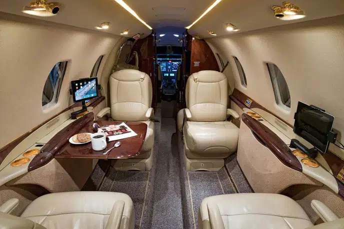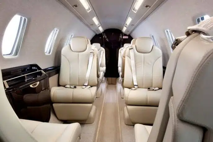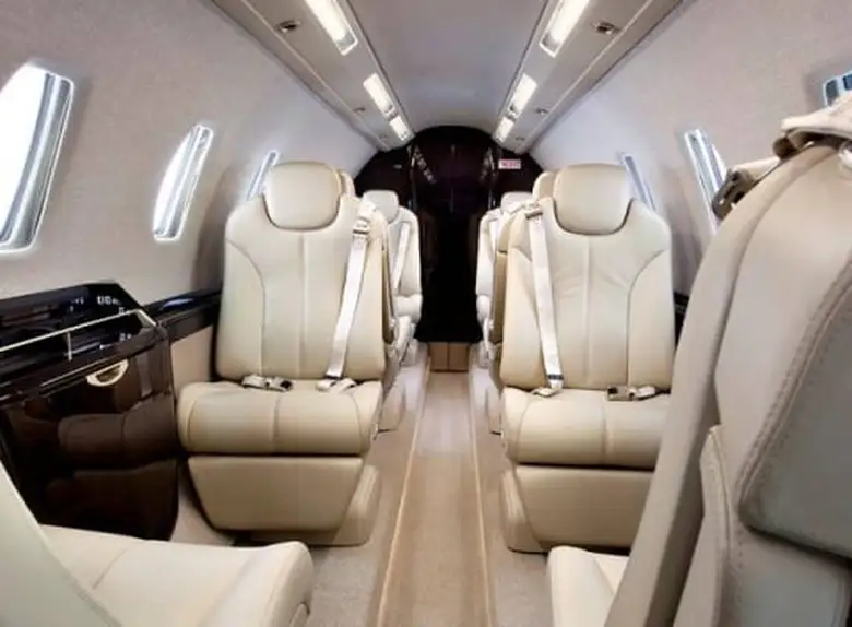Просторный салон с полной высотой потолка: Салон длиной 7,7 м и высотой 1,73 м вмещает до 9 пассажиров. Эргономичные кресла, просторный проход, столики, регулируемое освещение и шумоизоляция создают уютную атмосферу в полете.