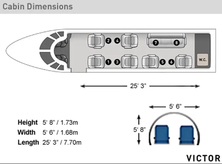 Citation Sovereign+ DCHEC рассчитан на 9 пассажиров. Багажное отделение объёмом 2.83 м³ позволяет разместить до 8 чемоданов L-размера . Максимальная дальность полёта — 5273 км.