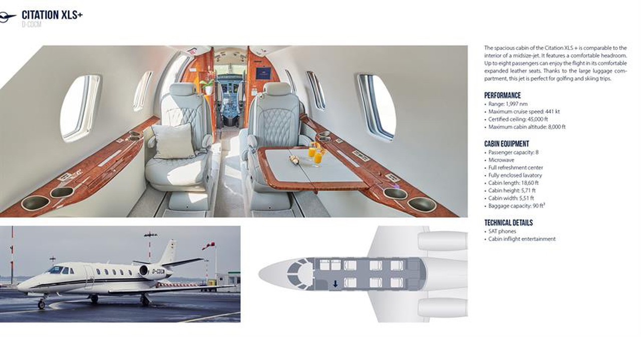 Citation XLS+ D-CDCM рассчитан на 8 пассажиров. Багажное отделение объёмом 2.55 м³ позволяет разместить до 7 чемоданов L-размера . Максимальная дальность полёта — 3440 км.