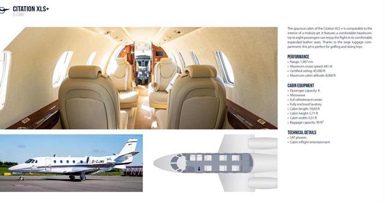 Citation XLS+ D-CJMK рассчитан на 8 пассажиров. Багажное отделение объёмом 2.55 м³ позволяет разместить до 7 чемоданов L-размера . Максимальная дальность полёта — 3440 км.