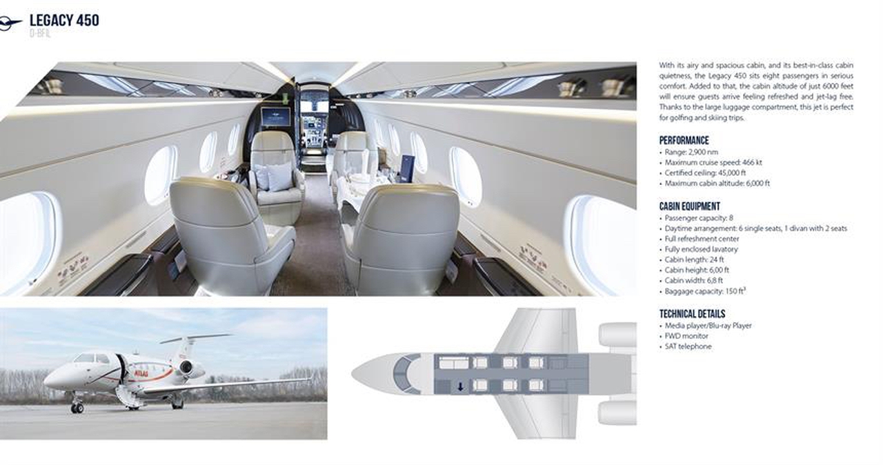 Legacy 450 D-BFIL рассчитан на 8 пассажиров. Багажное отделение объёмом 4.8 м³ позволяет разместить до 14 чемоданов L-размера . Максимальная дальность полёта — 5788 км.