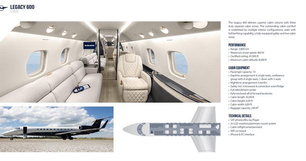 Legacy 600 D-AEOT рассчитан на 13 пассажиров. Багажное отделение объёмом 6.8 м³ позволяет разместить до 20 чемоданов L-размера . Максимальная дальность полёта — 6019 км.