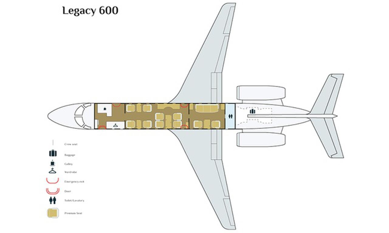 Legacy 600 F-HFKD рассчитан на 13 пассажиров. Багажное отделение объёмом 6.8 м³ позволяет разместить до 20 чемоданов L-размера . Максимальная дальность полёта — 6019 км.