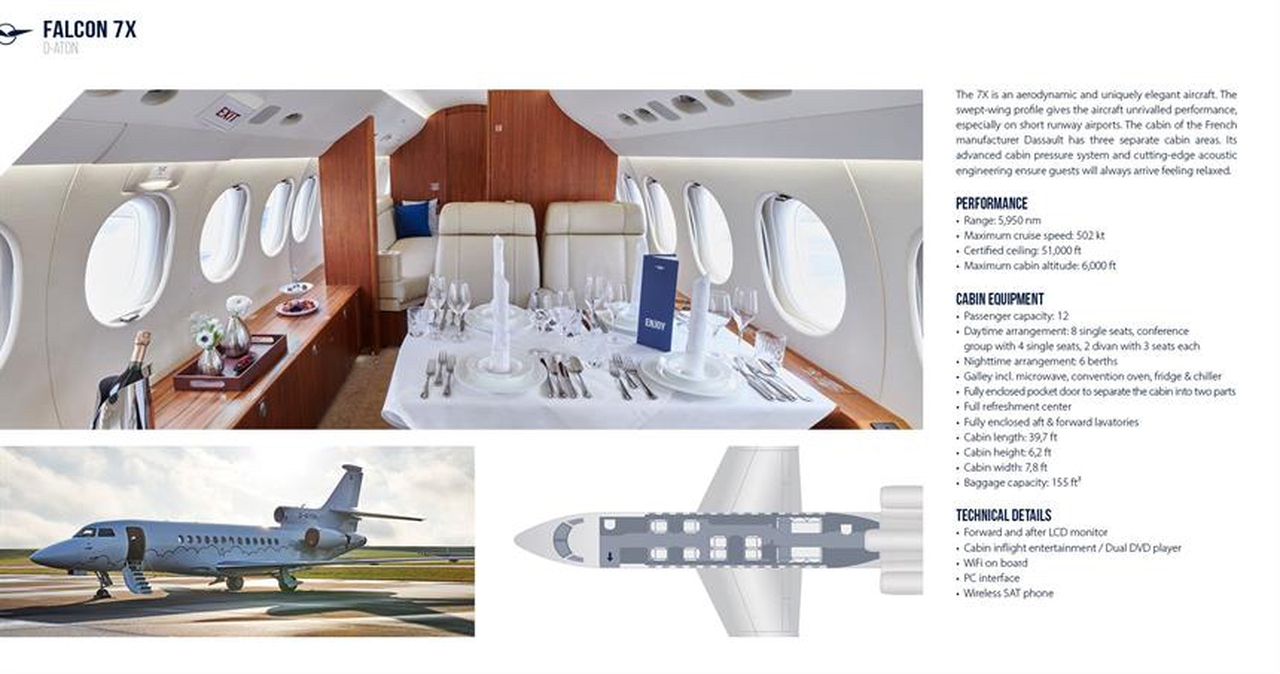 Falcon 7X D-ATON рассчитан на 12 пассажиров. Багажное отделение объёмом 4.45 м³ позволяет разместить до 13 чемоданов L-размера . Максимальная дальность полёта — 11020 км.