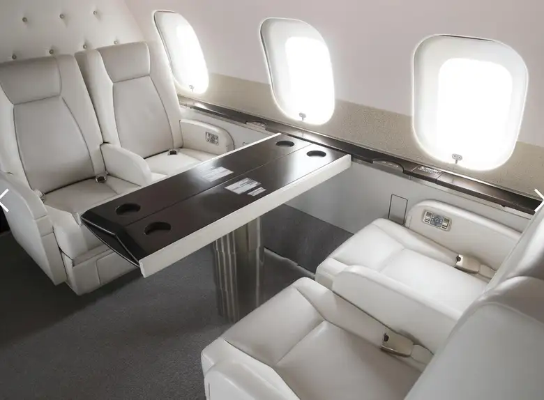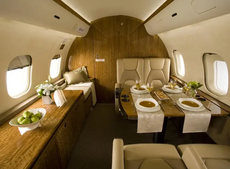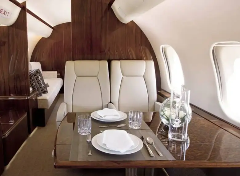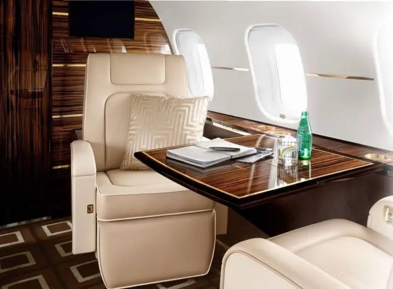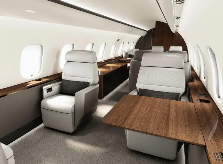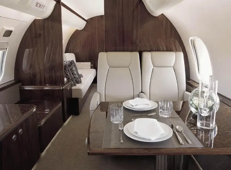 Салон Global 5000 отличается простором и роскошной отделкой. Он обычно разделен на три зоны, обеспечивая пассажирам комфортные условия для работы, отдыха и приема пищи.