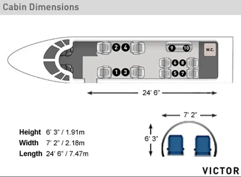 Gulfstream G200 N-283DJ рассчитан на 9 пассажиров. Багажное отделение объёмом 4.2 м³ позволяет разместить до 12 чемоданов L-размера . Максимальная дальность полёта — 6301 км.