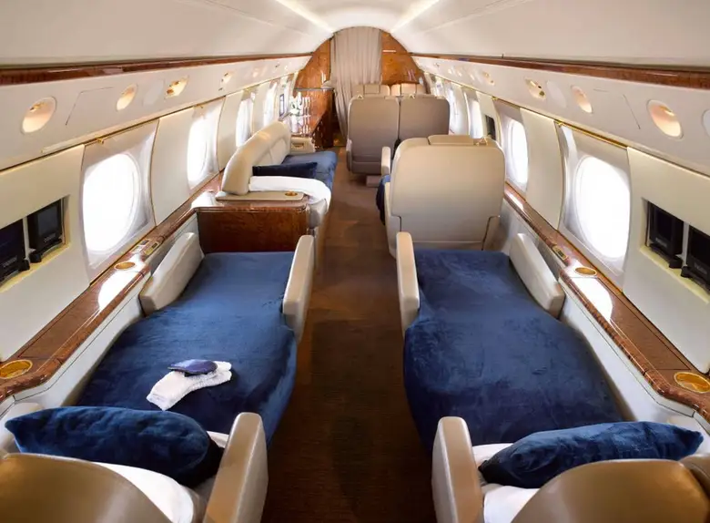 - Просторный и роскошный салон: G-V предлагает большой салон с достаточным пространством для 12-16 пассажиров в типовых конфигурациях. Размеры салона составляют примерно 15,3 метра в длину, 2,2 метра в ширину и 1,9 метра в высоту, обеспечивая комфортную обстановку для работы, отдыха и сна во время дальних перелетов. Часто включает несколько зон для приватности и продуктивности.