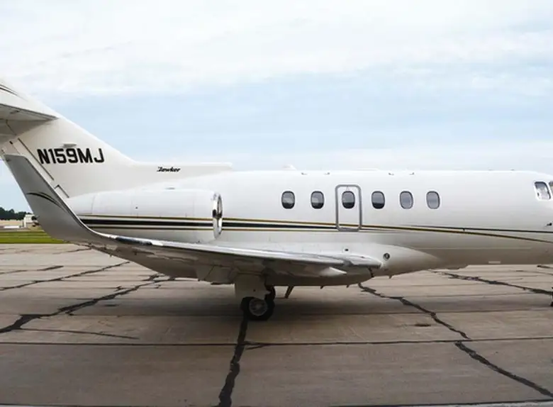 Hawker 850XP N159MJ . Багажное отделение объёмом 1.4 м³ позволяет разместить до 4 чемоданов L-размера . Максимальная дальность полёта — 4893 км.