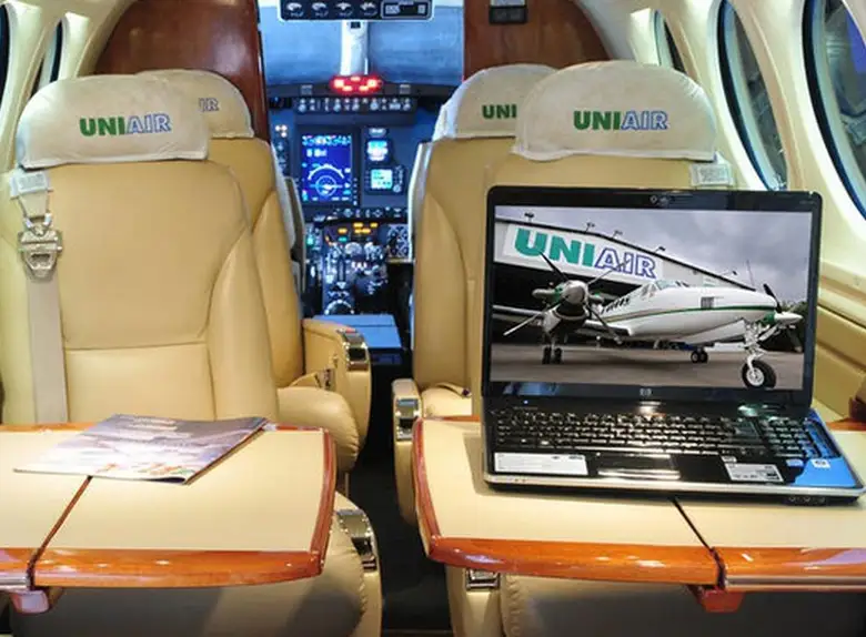 King Air 200C PR-UNI рассчитан на 6 пассажиров. Багажное отделение объёмом 1.85 м³ . Максимальная дальность полёта — 3333 км.