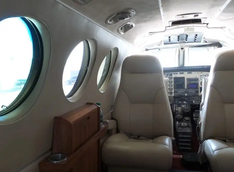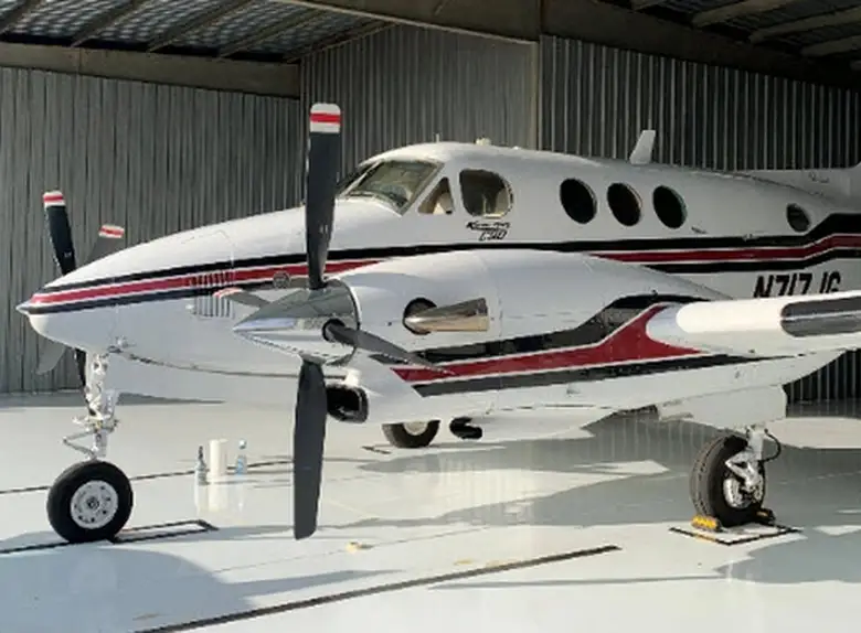 King Air C90A N717JG . Багажное отделение объёмом 1.37 м³ позволяет разместить до 4 чемоданов L-размера . Максимальная дальность полёта — 2446 км.