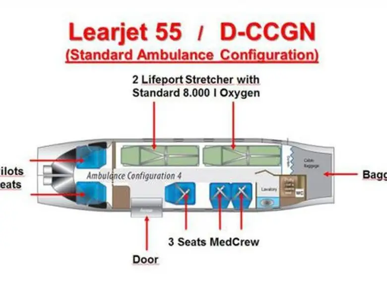 Learjet 55 D-CCGN . Багажное отделение объёмом 1.9 м³ позволяет разместить до 5 чемоданов L-размера . Максимальная дальность полёта — 4010 км.