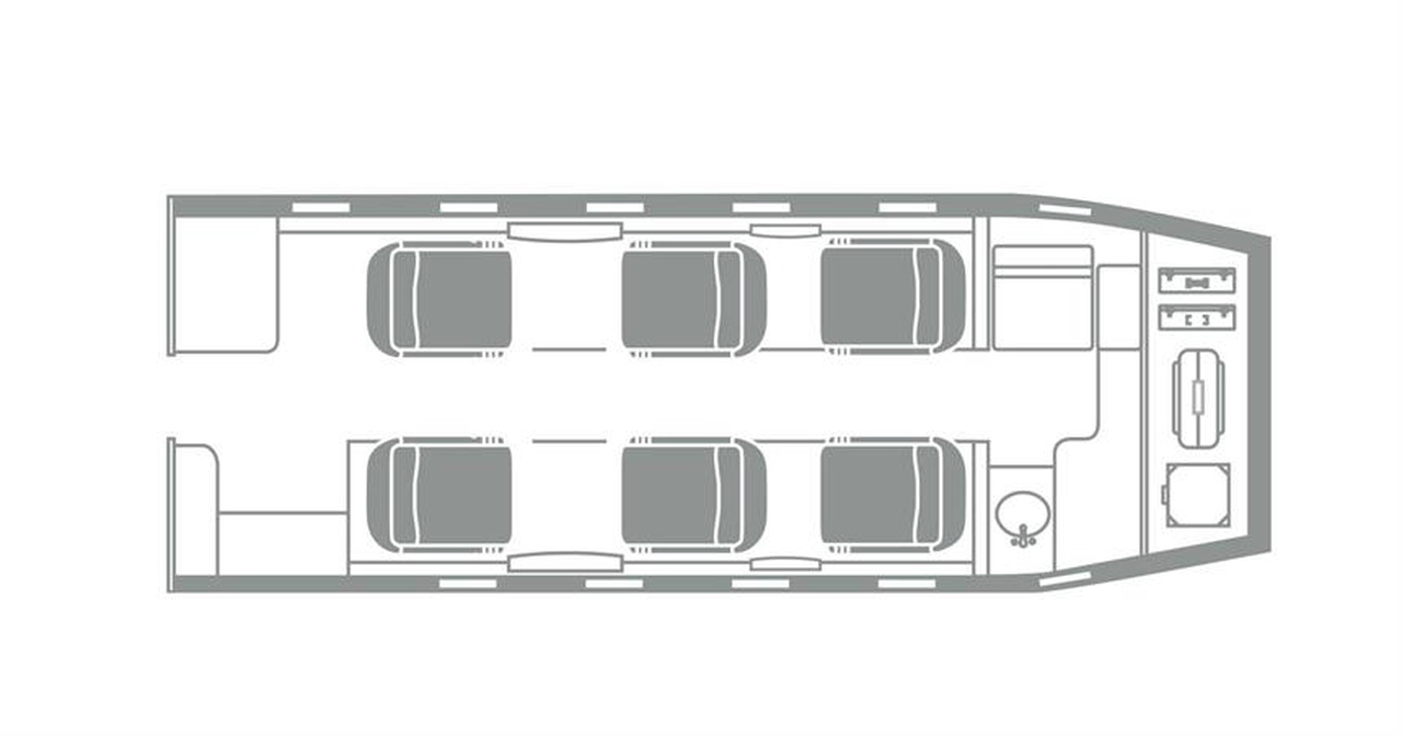 Learjet 60XR A6-VGG рассчитан на 6 пассажиров. Багажное отделение объёмом 1.36 м³ позволяет разместить до 4 чемоданов L-размера . Максимальная дальность полёта — 4539 км.