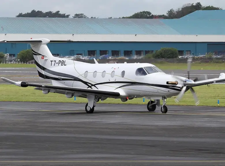 Pilatus PC-12/47 T7-PBL . Багажное отделение объёмом 1.13 м³ позволяет разместить до 3 чемоданов L-размера . Максимальная дальность полёта — 2976 км.