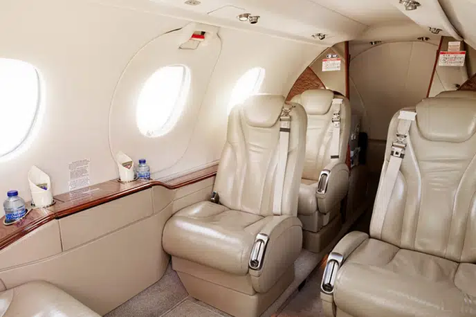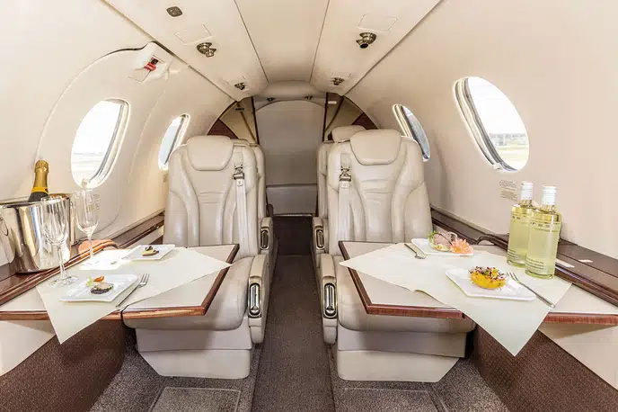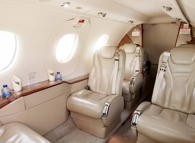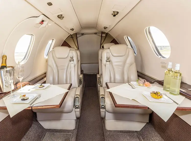- Просторный салон: Premier 1 может похвастаться одним из самых больших салонов в категории легких джетов, обычно вмещающим 6-7 пассажиров в комфортабельной конфигурации. Овальная форма салона способствует его щедрому пространству над головой и ширине на уровне плеч.